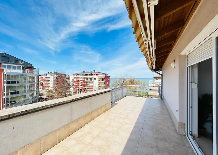 1-slaapkamer Merland Premium Penthouse - Lakeview is voorzien van gratis priveparkeerplaatsen en wifi en ligt in de Siofok Aranypart wijk van Siófok. Dit appartement van 86 m^2, gelegen op slechts 10 minuten lopen van de bushalte Darnay Kalman ter, biedt gemakkelijk toegang tot de Watertoren van Siófok, op 10 minuten rijafstand.